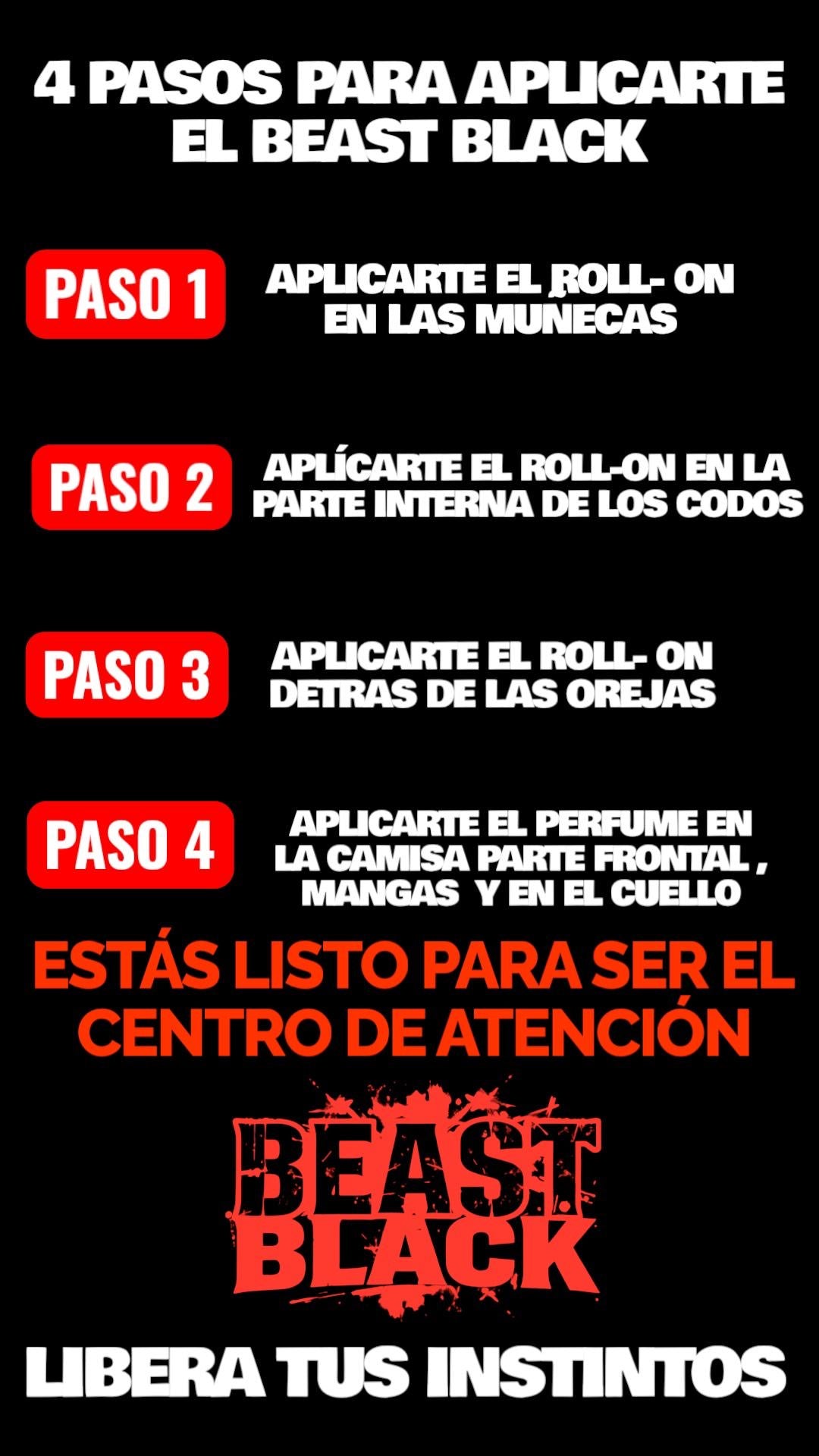Usar Beast Black no es solo elegir un perfume, es decidir proyectar seguridad, atracción y poder en cada momento. Gracias a su exclusiva fórmula con feromonas, este aroma está diseñado para potenciar tu confianza y resaltar tu esencia masculina, logrando que dejes una huella inolvidable donde vayas. Su fragancia intensa y sofisticada combina elegancia con seducción, convirtiéndolo en el aliado perfecto para citas, reuniones o cualquier ocasión en la que quieras destacar. Con alta fijación y larga duración, Beast Black se convierte en el toque final que eleva tu presencia y hace que los demás no puedan olvidarte.